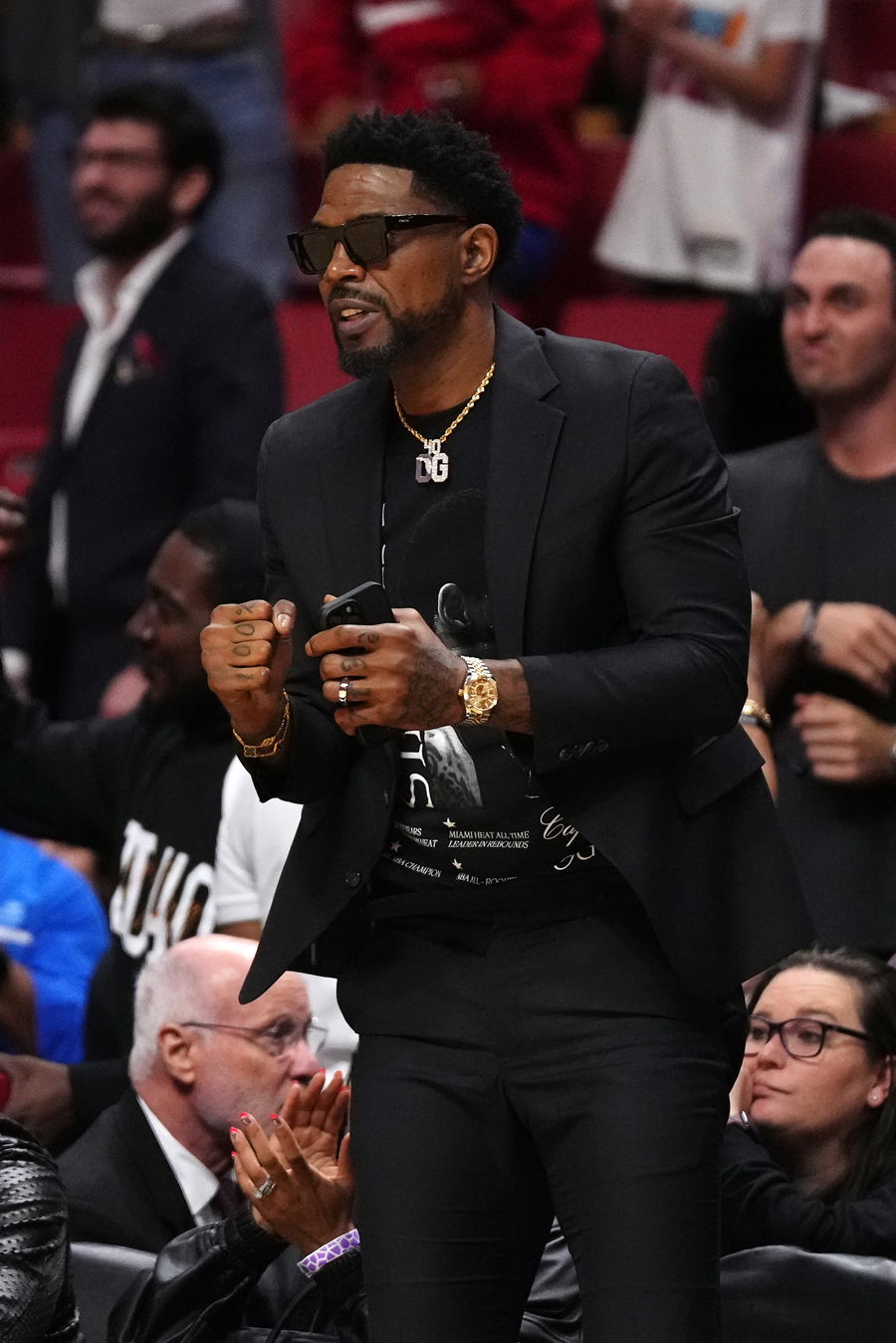 Jan 19, 2024; Miami, Florida, USA; Former Miami Heat player Udonis Haslem reacts after a Miami Heat basket against the Atlanta Hawks during the second half at Kaseya Center. Mandatory Credit: Jasen Vinlove-USA TODAY Sports