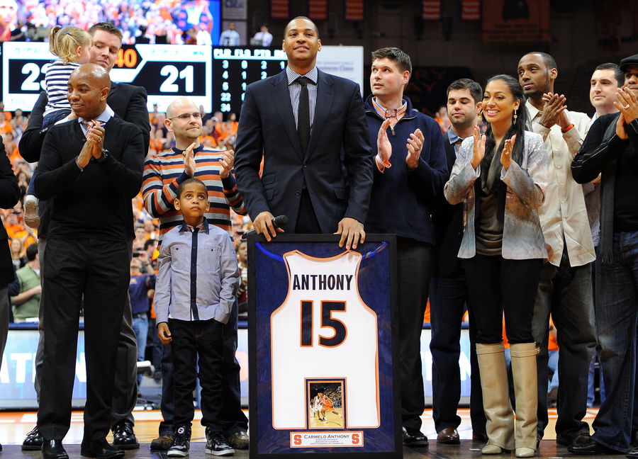 Feb 23, 2013; Syracuse, NY, USA; Syracuse Orange former player Carmelo Anthony (right) is presented his jersey by Syracuse Orange director of athletics Dr. Daryl Gross (left) at his number retirement ceremony during halftime of the game against the Georgetown Hoyas at the Carrier Dome. Georgetown defeated Syracuse 57-46. Mandatory Credit: Rich Barnes-USA TODAY Sports