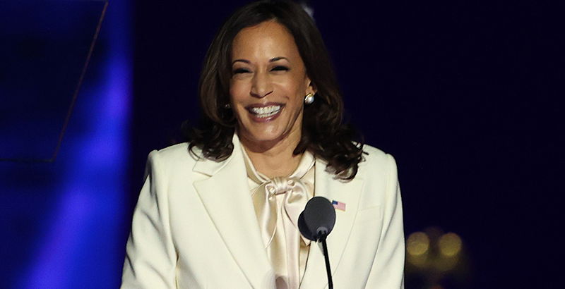 WILMINGTON, DELAWARE – NOVEMBER 07: Vice President-elect Kamala Harris takes the stage before President-elect Biden addresses the nation from the Chase Center November 07, 2020 in Wilmington, Delaware. After four days of counting the high volume of mail-in ballots in key battleground states due to the coronavirus pandemic, the race was called for Biden after a contentious election battle against incumbent Republican President Donald Trump. (Photo by Tasos Katopodis/Getty Images)