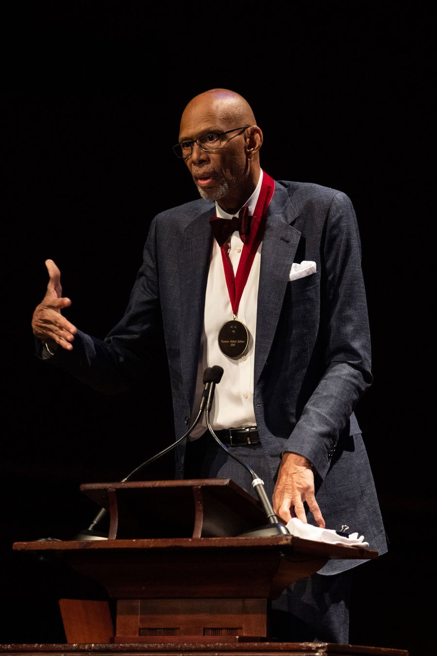 CAMBRIDGE, MA – OCTOBER 06: National Basketball Association NBA, Basketball Herren, USA legend Kareem Abdul-Jabbar speaks to the audience after receiving his medal during the Harvard University Hutchins Center Honors W.E.B. Du Bois Medal Ceremony on October 6, 2022, at Sanders Theatre in Cambridge, MA. Photo by Erica Denhoff/Icon Sportswire OTHER: OCT 06 Kareem Abdul-Jabbar Receives W.E.B. Dubois Medal Icon22100613