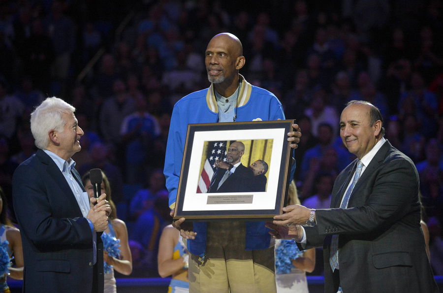January 21, 2017; Los Angeles, CA, USA; UCLA Bruins former player Kareem Abdul-Jabbar is presented a photograph of his receiving the Presidential Medal of Freedom by school chancellor Gene Block (left) and athletic director Dan Guerrero during halftime before the UCLA Bruins play against the Arizona Wildcats at Pauley Pavilion. Mandatory Credit: Gary A. Vasquez-USA TODAY Sports