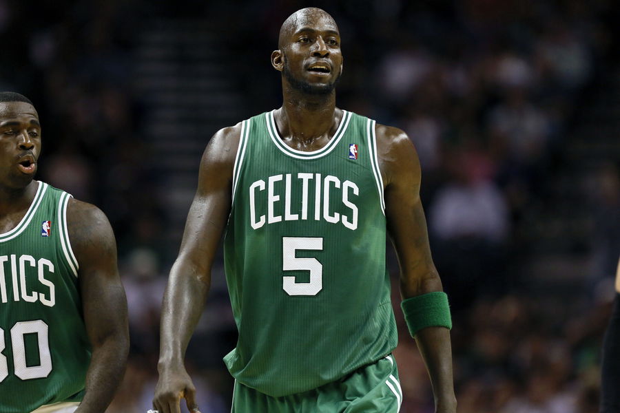 Dec 15, 2012; San Antonio, TX, USA; Boston Celtics center Kevin Garnett (5) walks down the court during the first half against the San Antonio Spurs at the AT&T Center. Mandatory Credit: Soobum Im-USA TODAY Sports