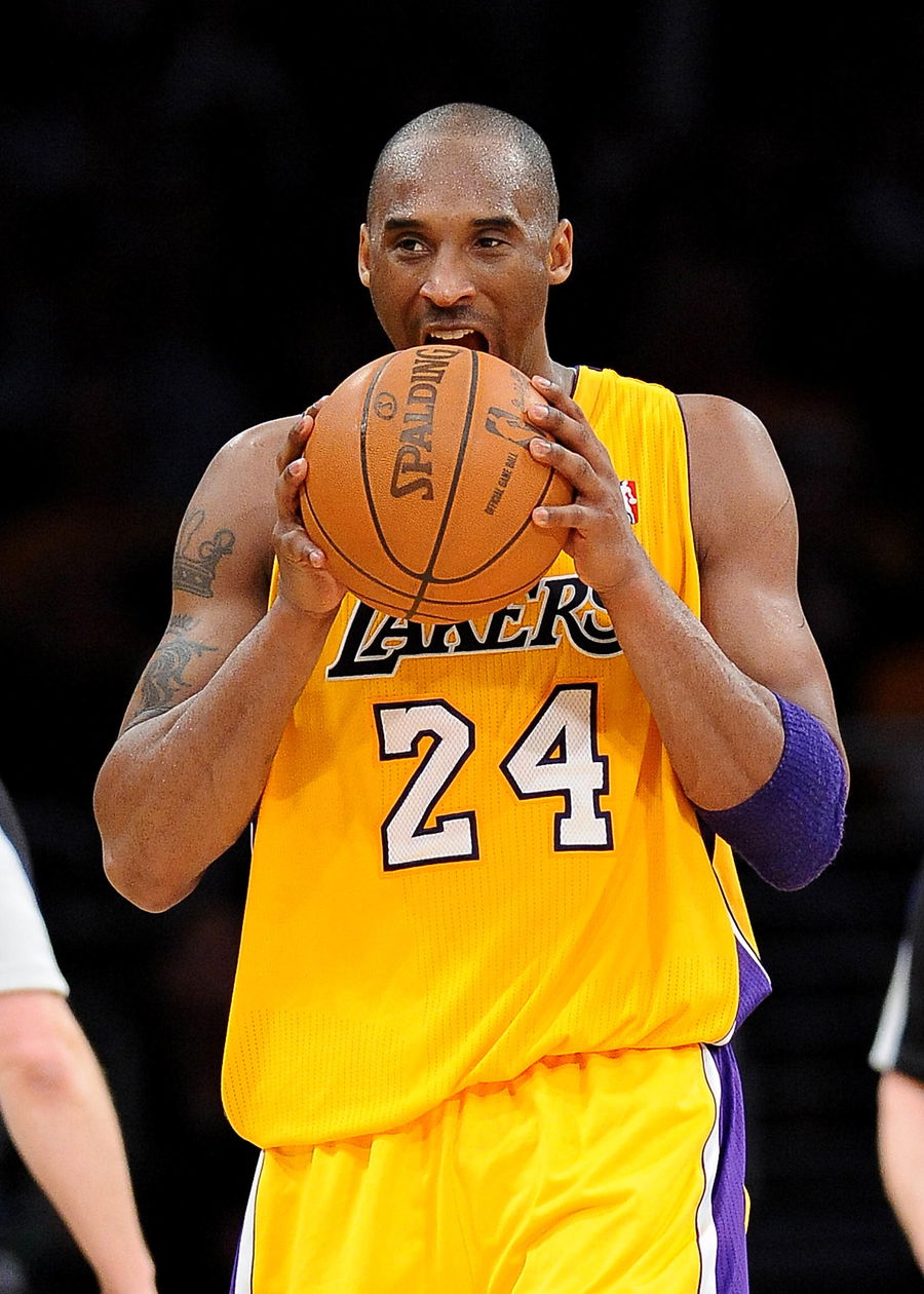 Feb. 20, 2012; Los Angeles, CA, USA; Los Angeles Lakers shooting guard Kobe Bryant (24) bites the basketball during the second half of the game against the Portland Trail Blazers at the Staples Center. Lakers won 103-92. Mandatory Credit: Jayne Kamin-Oncea-USA TODAY Sports