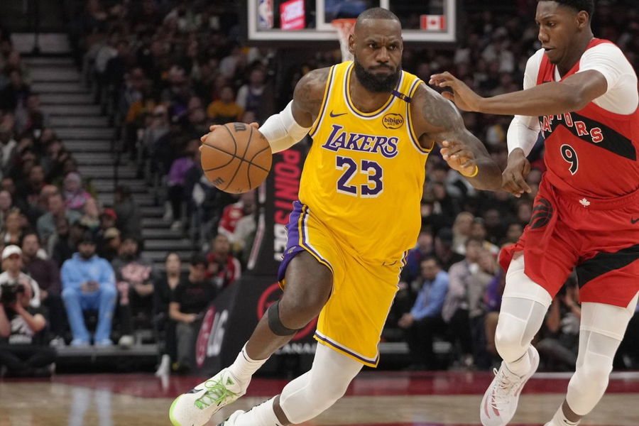 Nov 1, 2024; Toronto, Ontario, CAN; Los Angeles Lakers forward LeBron James (23) drives to the net against Toronto Raptors guard RJ Barrett (9) during the first half at Scotiabank Arena. Mandatory Credit: John E. Sokolowski-Imagn Images