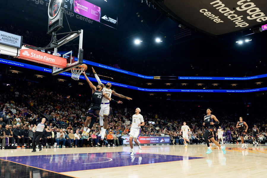 Dec 14, 2025; Phoenix, Arizona, USA; Los Angeles Lakers forward LeBron James (23) blocks a shot by Phoenix Suns guard Jordan Goodwin (23) from behind during the first half of a game at Mortgage Matchup Center. Mandatory Credit: Allan Henry-Imagn Images