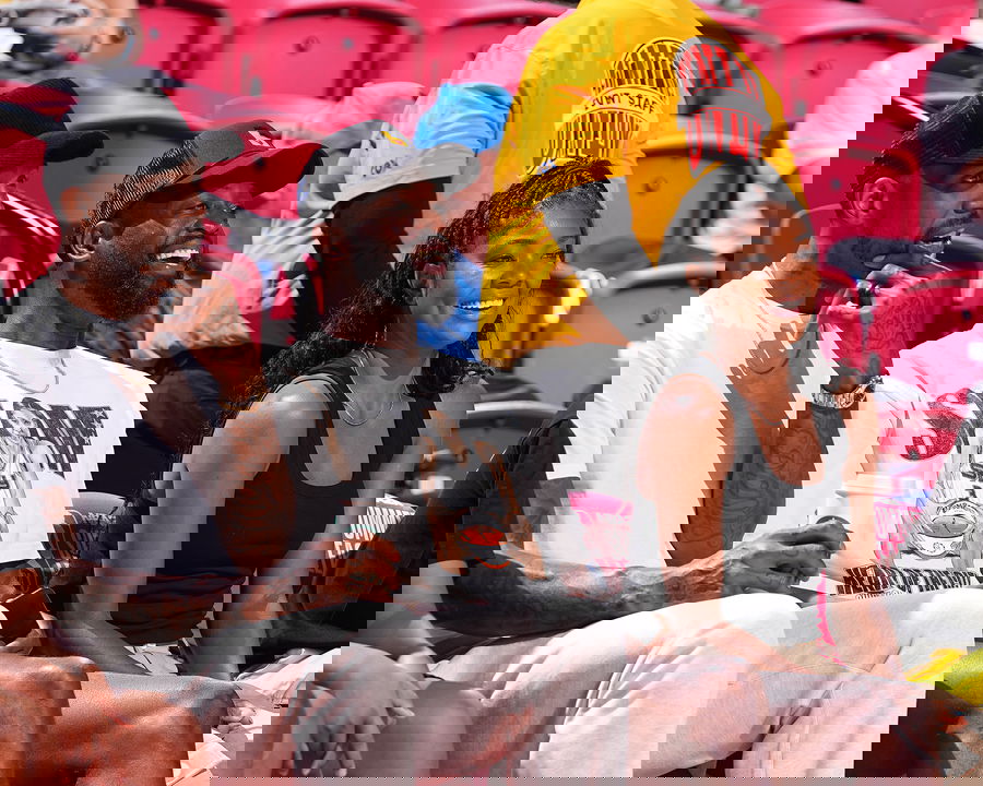 LAS VEGAS, NV – JULY 16: Udonis Haslem, Dwyane Wade, and Gabrielle Union attend a game between the Miami Heat and the Portland Trail Blazers during the 2023 NBA Las Vegas Summer League on July 16, 2023 at the Thomas & Mack Center in Las Vegas, Nevada. NOTE TO USER: User expressly acknowledges and agrees that, by downloading and or using this photograph, User is consenting to the terms and conditions of the Getty Images License Agreement. Mandatory Copyright Notice: Copyright 2023 NBAE (Photo by Bart Young/NBAE via Getty Images)