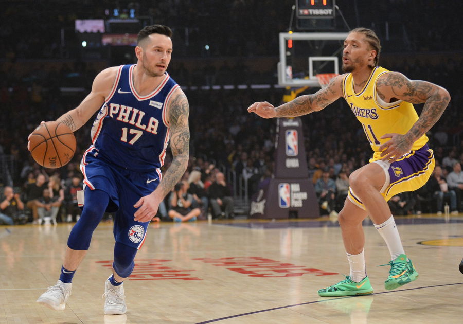 January 29, 2019; Los Angeles, CA, USA; Philadelphia 76ers guard JJ Redick (17) moves the ball against Los Angeles Lakers forward Michael Beasley (11) during the first half at Staples Center. Mandatory Credit: Gary A. Vasquez-USA TODAY Sports