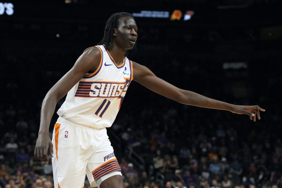 Oct 16, 2023; Phoenix, Arizona, USA; Phoenix Suns center Bol Bol (11) points for the play against the Portland Trail Blazers in the second half at Footprint Center. Mandatory Credit: Rick Scuteri-USA TODAY Sports