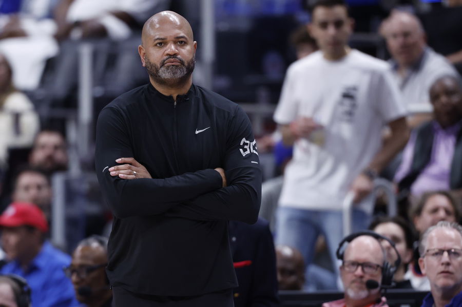 Apr 24, 2025; Detroit, Michigan, USA; Detroit Pistons head coach J.B. Bickerstaff looks on in the second half against the New York Knicks during game three of first round for the 2024 NBA Playoffs at Little Caesars Arena. Mandatory Credit: Rick Osentoski-Imagn Images