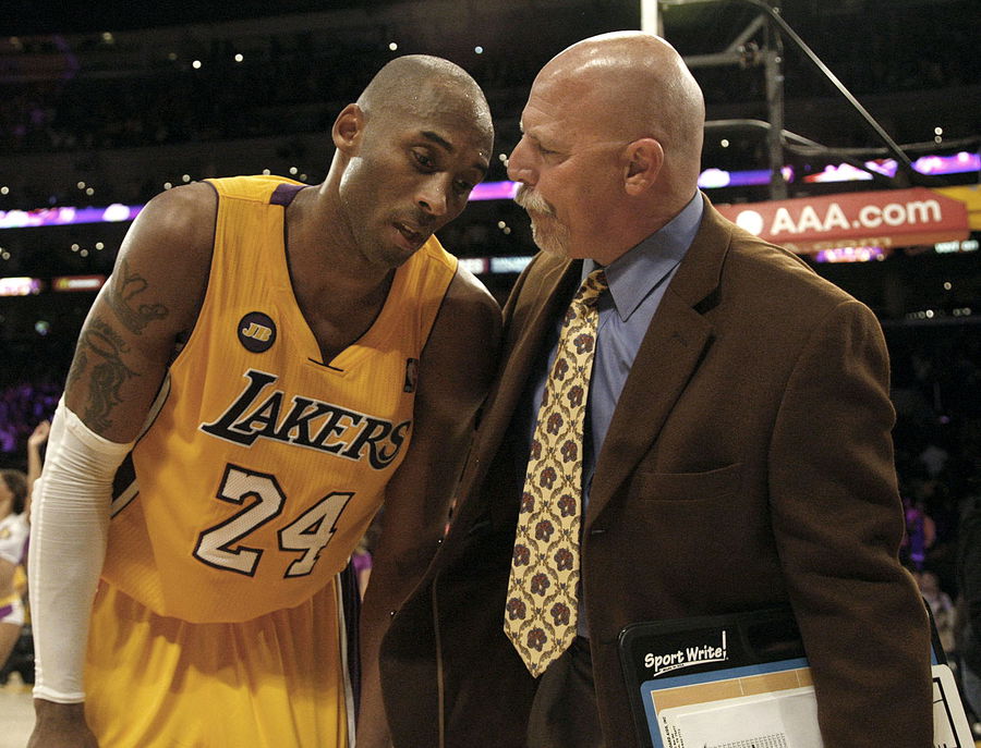 Gary Vitti, (right) trainer for the Los Angeles Lakers, talks with an exhausted Kobe Bryant, guard for the Los Angeles Lakers, after the Lakers beat the Toronto Raptors in overtime 118-116 at Staples Center on March 8, 2013. (Photo by Gary Friedman/Los Angeles Times via Getty Images)