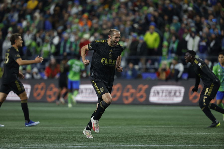 Nov 26, 2023; Seattle, Washington, USA; Los Angeles FC defender Giorgio Chiellini (14) celebrates after defeating the Seattle Sounders during a MLS Cup Western Conference Semifinal match at Lumen Field. Mandatory Credit: Joe Nicholson-USA TODAY Sports