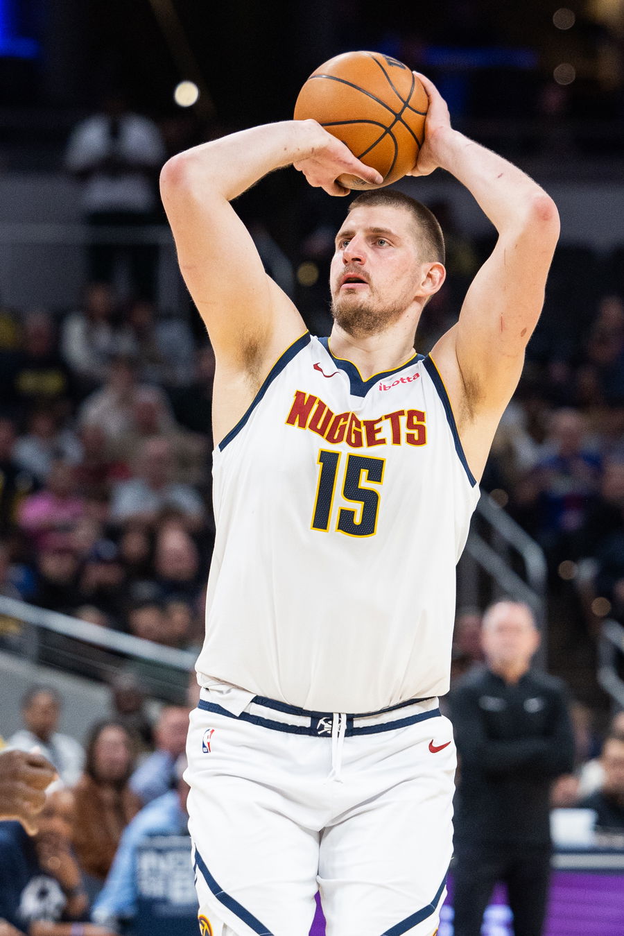 Apr 6, 2025; Denver, Colorado, USA; Denver Nuggets center Nikola Jokic (15) during the second quarter against the Indiana Pacers at Ball Arena. Mandatory Credit: Ron Chenoy-Imagn Images