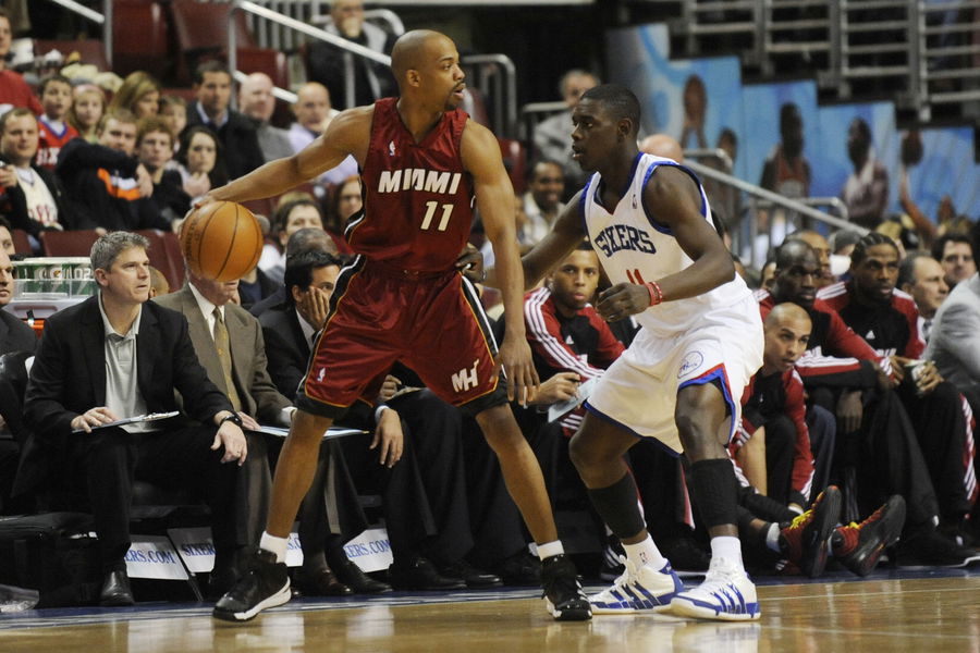 Feb 16, 2010; Philadelphia, PA, USA; Miami Heat guard Rafer Alston (11) is defended by Philadelphia 76ers guard Jrue Holiday (11) during the first quarter at the Wachovia Center. The Heat defeated the 76ers 105-78. Mandatory Credit: Howard Smith-USA TODAY Sports
