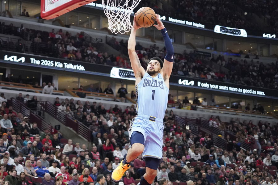 Nov 23, 2024; Chicago, Illinois, USA; Memphis Grizzlies guard Scotty Pippen Jr. (1) scores on a breakaway against the Chicago Bulls during the first quarter at United Center. Mandatory Credit: David Banks-Imagn Images