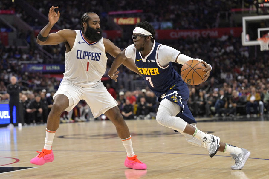 Apr 4, 2024; Los Angeles, California, USA; Denver Nuggets guard Reggie Jackson (7) is defended by Los Angeles Clippers guard James Harden (1) in the second half at Crypto.com Arena. Mandatory Credit: Jayne Kamin-Oncea-USA TODAY Sports