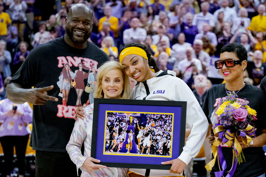 Mar 3, 2024; Baton Rouge, Louisiana, USA; LSU Lady Tigers forward Angel Reese takes a photo for senior night with former LSU player and NBA champion Shaquille O’Neal, LSU Lady Tigers head coach Kim Mulkey, and Reese’s mother Angel Webb against the Kentucky Wildcats at Pete Maravich Assembly Center. Mandatory Credit: Matthew Hinton-USA TODAY Sports