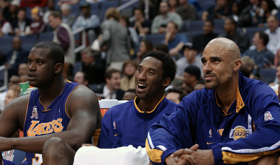 WASHINGTON, DC – APRIL 2: Kobe Bryant #8, Shaquille O’Neal #34 and Rick Fox #17 of the Los Angeles Lakers watch the game against the Washington Wizards on April 2, 2002. (Photo by G Fiume/Getty Images)