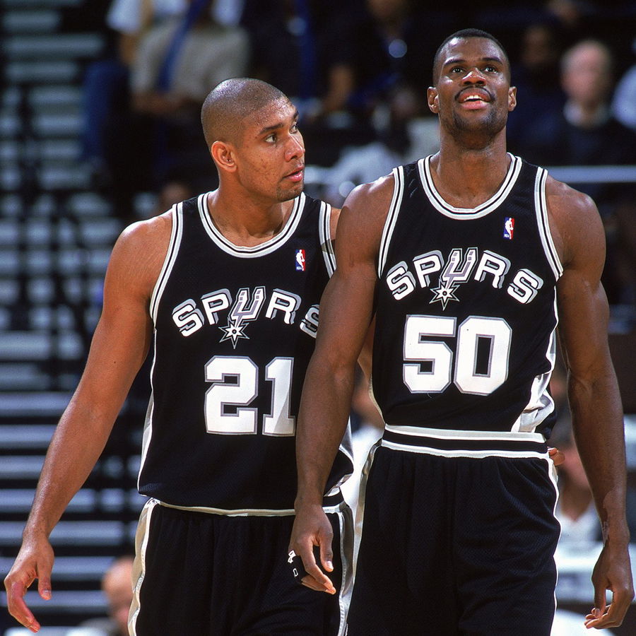 9 Nov 1999: David Robinson #50 of the San Antonio Spurs walks on the court with teammate Tim Duncan #21during a game against the Golden State Warriors at the Oakland Coliseum in Oakland, California. The Spurs defeated the Warriors 118-89. Mandatory Credit: Jed Jacobsohn /Allsport