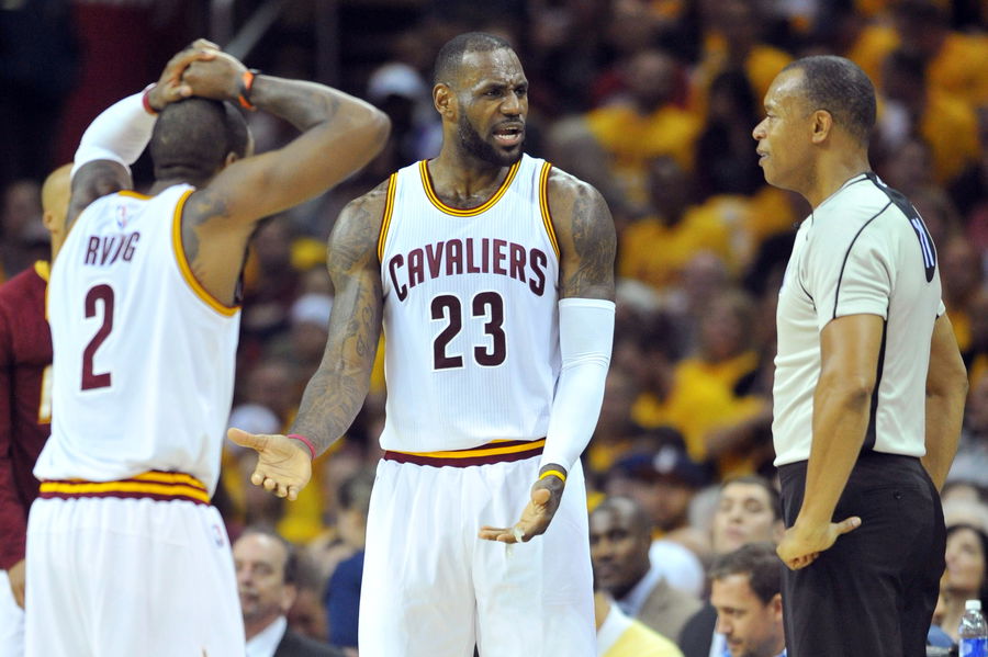 May 4, 2016; Cleveland, OH, USA; Cleveland Cavaliers forward LeBron James (23) disputes a foul call to referee Rodney Mott (71) during the second quarter in game two of the second round of the NBA Playoffs at Quicken Loans Arena. Mandatory Credit: Ken Blaze-USA TODAY Sports
