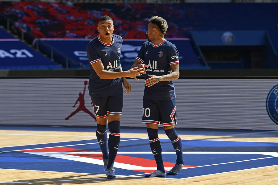 PARIS, FRANCE – MAY 17: Kylian Mbappe and Neymar Jr react as the Paris Saint-Germain unveils the new Jordan kit on May 17, 2021 in Paris, France. (Photo by Aurelien Meunier – PSG/PSG via Getty Images)