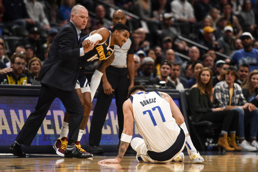 DENVER, CO – OCTOBER 29: Gary Harris (14) of the Denver Nuggets is helped up by head coach Michael Malone after colliding with Luka Doncic (77) of the Dallas Mavericks during the first quarter on Tuesday, October 29, 2019. (Photo by AAron Ontiveroz/MediaNews Group/The Denver Post via Getty Images)