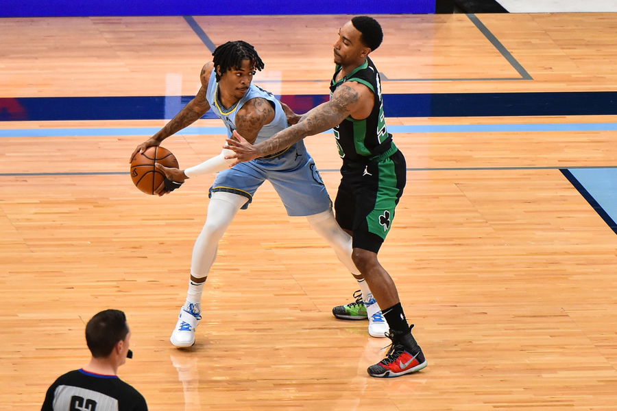Mar 22, 2021; Memphis, Tennessee, USA; Memphis Grizzlies guard Ja Morant (12) handles the ball against Boston Celtics guard Jeff Teague (55) during the first half at FedExForum. Mandatory Credit: Justin Ford-USA TODAY Sports