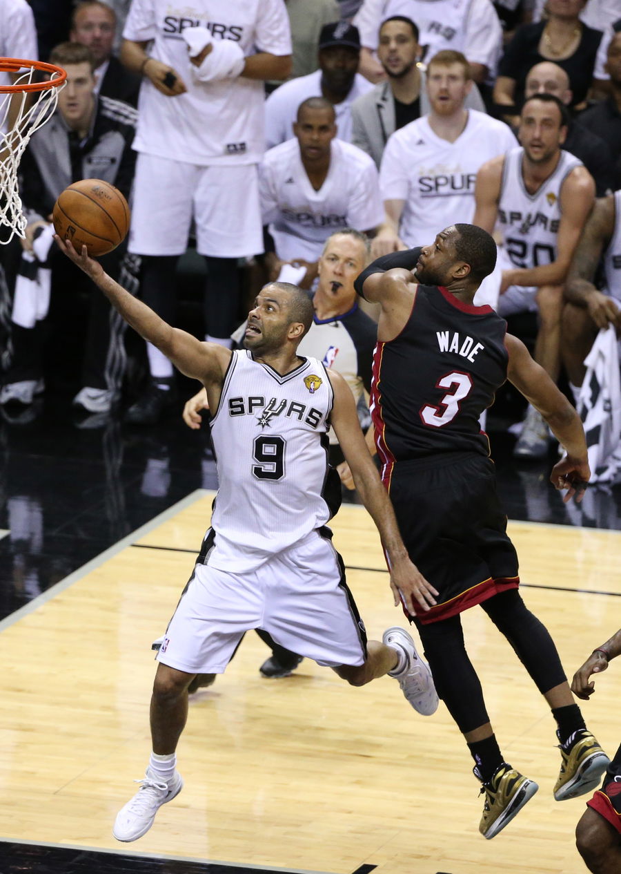 Jun 8, 2014; San Antonio, TX, USA; San Antonio Spurs guard Tony Parker (9) shoots against Miami Heat guard Dwyane Wade (3) in game two of the 2014 NBA Finals at AT&T Center. Mandatory Credit: Soobum Im-USA TODAY Sports