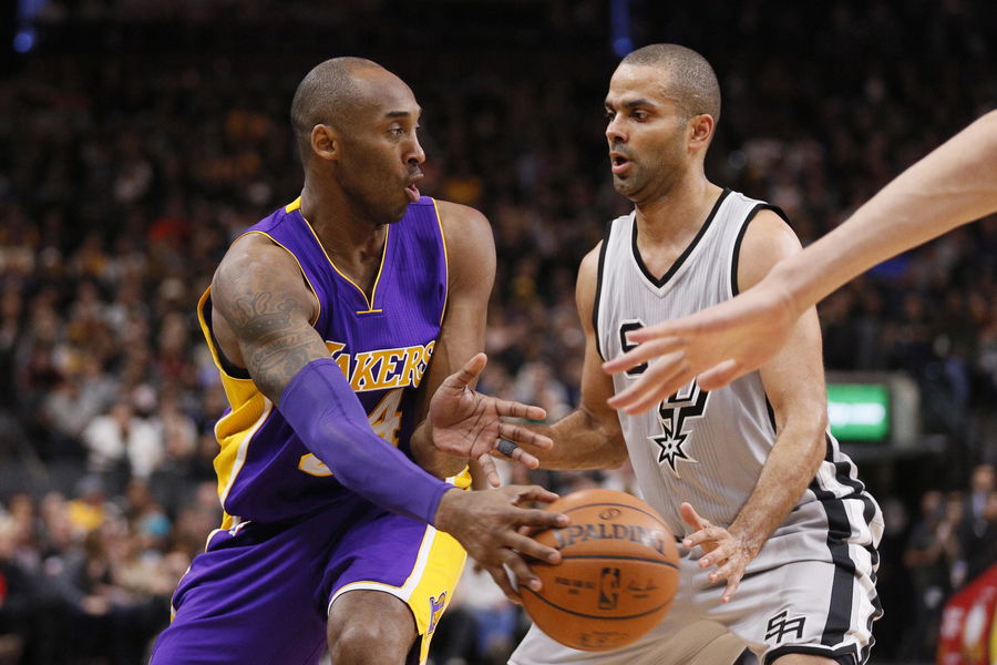Feb 6, 2016; San Antonio, TX, USA; Los Angeles Lakers small forward Kobe Bryant (24) passes the ball around San Antonio Spurs point guard Tony Parker (9) during the first half at AT&T Center. Mandatory Credit: Soobum Im-USA TODAY Sports