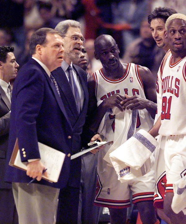 Apr 24, 1998; Chicago, IL, USA; Chicago Bulls coach Phil Jackson, second from left, with assistant coach Frank Hamblen, left, Michael Jordan, middle, Toni Kukoc and Dennis Rodman during a playoff game against the New Jersey Nets at the United Center. Mandatory Credit: Anne Ryan-USA TODAY