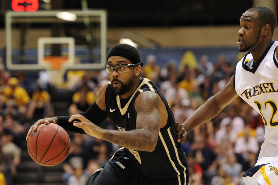 Mar 14, 2012; Philadelphia, PA, USA; Central Florida Knights guard Marcus Jordan (5) is defended by Drexel Dragons guard Derrick Thomas (32) during the second half of the first round of the 2012 NIT at Daskalakis Athletic Center. Drexel defeated Central Florida 81-56. Mandatory Credit: Howard Smith-USA TODAY Sports.