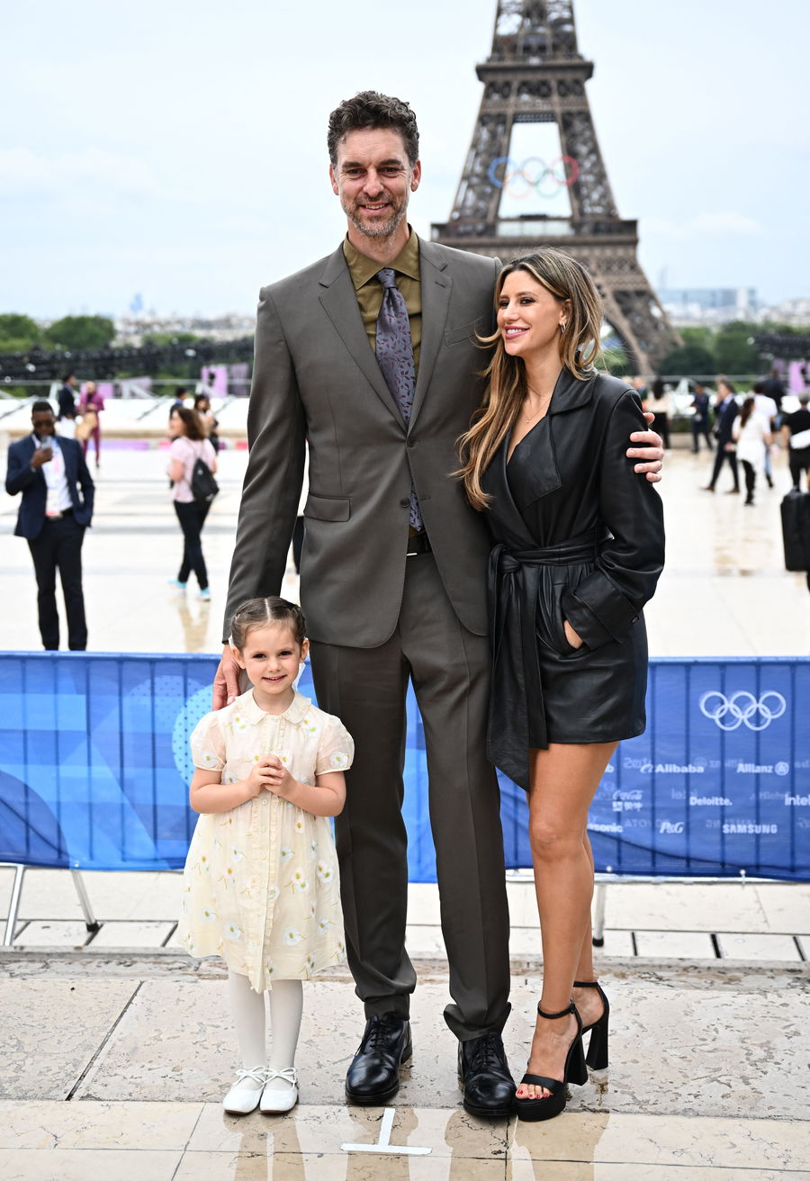 Paris 2024 Olympics – Opening Ceremony – Paris, France – July 26, 2024. Former basketball player Pau Gasol and his wife Catherine McDonnell and their daughter Elisabet Gasol pose for a photo in front of the Eiffel Tower as he arrives for the opening ceremony. REUTERS/Dylan Martinez