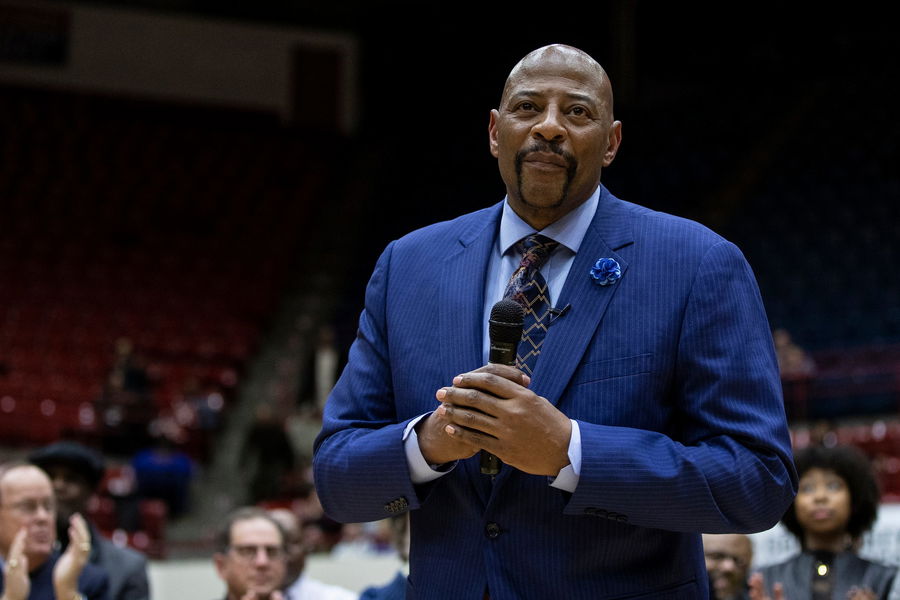 Earl Cureton speaks during his jersey retirement ceremony at Calihan Hall in Detroit, Thursday, Jan. 23, 2020.Credit: © Junfu Han / USA TODAY NETWORK via Imagn Images