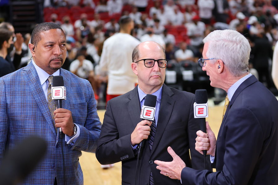 MIAMI, FLORIDA – MAY 19: ESPN Analysts, Mark Jackson, Jeff Van Gundy, and Mike Breen look on prior to Game Two of the 2022 NBA Playoffs Eastern Conference Finals between the Miami Heat and the Boston Celtics at FTX Arena on May 19, 2022 in Miami, Florida. NOTE TO USER: User expressly acknowledges and agrees that, by downloading and or using this photograph, User is consenting to the terms and conditions of the Getty Images License Agreement. (Photo by Michael Reaves/Getty Images)