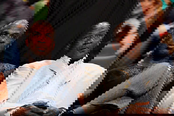 CHARLOTTE, NC – APRIL 14: Charles Oakley and Michael Jordan watch the game of the Charlotte Bobcats against the Chicago Bulls on April 14, 2010 at the Time Warner Cable Arena in Charlotte, North Carolina. NOTE TO USER: User expressly acknowledges and agrees that, by downloading and or using this photograph, User is consenting to the terms and conditions of the Getty Images License Agreement. Mandatory Copyright Notice: Copyright 2010 NBAE (Photo by Kent Smith/NBAE via Getty Images)