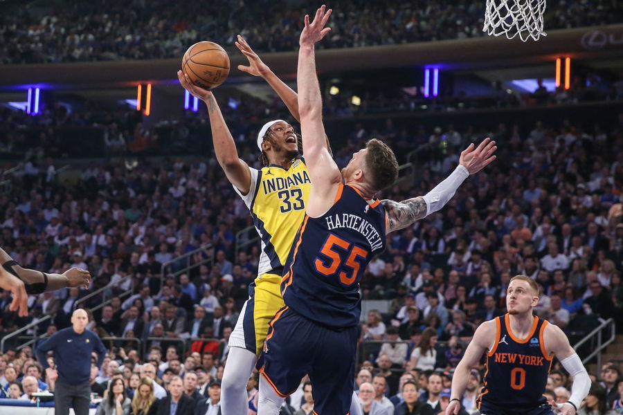 May 8, 2024; New York, New York, USA; Indiana Pacers center Myles Turner (33) shoots against New York Knicks center Isaiah Hartenstein (55) in the third quarter during game two of the second round for the 2024 NBA playoffs at Madison Square Garden. Mandatory Credit: Wendell Cruz-USA TODAY Sports