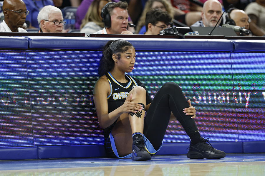 Aug 25, 2024; Chicago, Illinois, USA; Chicago Sky forward Angel Reese (5) waits to enter the game against the Las Vegas Aces during the first half at Wintrust Arena. Mandatory Credit: Kamil Krzaczynski-USA TODAY Sports