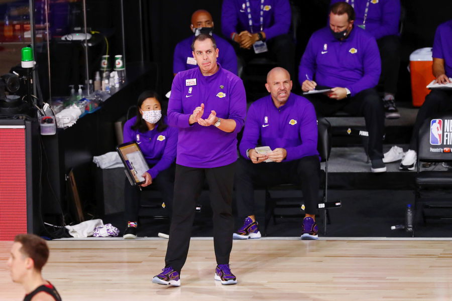 Oct 11, 2020; Lake Buena Vista, Florida, USA; Los Angeles Lakers head coach Frank Vogel claps after a play against the Miami Heat during the second quarter in game six of the 2020 NBA Finals at AdventHealth Arena. Mandatory Credit: Kim Klement-USA TODAY Sports