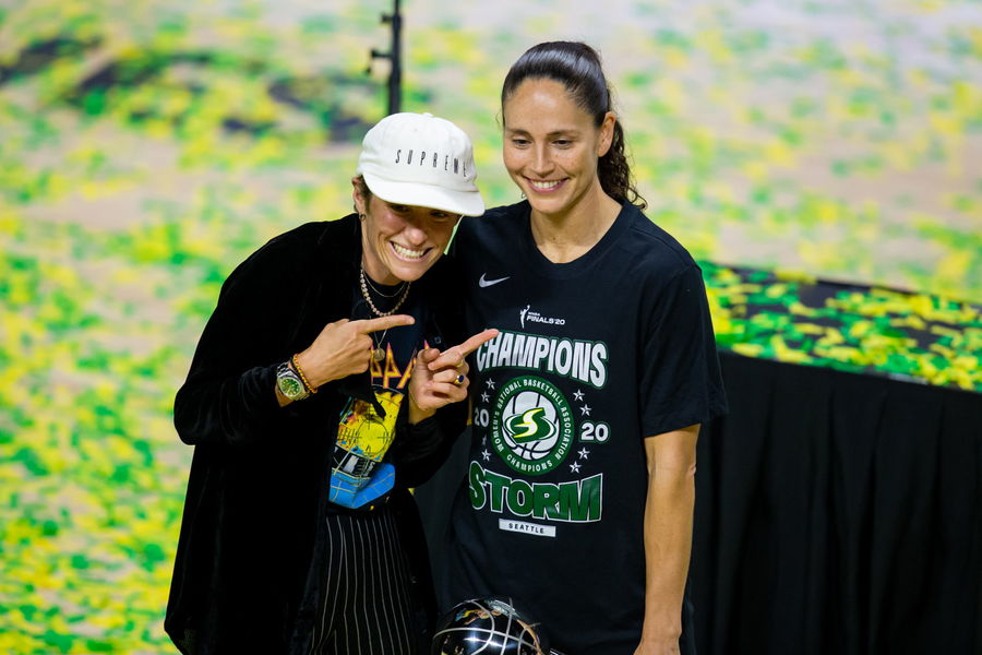 Oct 6, 2020; Bradenton, Florida, USA; Seattle Storm guard Sue Bird (10) poses with Meg Rapinoe after winning the 2020 WNBA Finals at IMG Academy. Mandatory Credit: Mary Holt-USA TODAY Sports