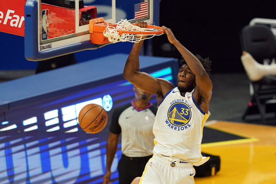 Jan 10, 2021; San Francisco, California, USA; Golden State Warriors center James Wiseman (33) dunks during the first quarter against the Toronto Raptors at Chase Center. Mandatory Credit: Darren Yamashita-USA TODAY Sports