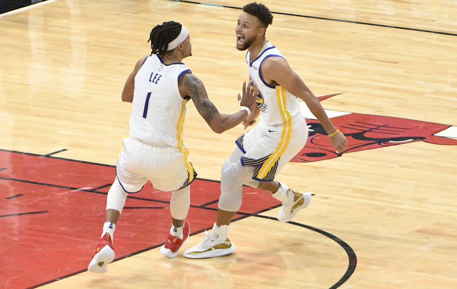 Dec 27, 2020; Chicago, Illinois, USA; Golden State Warriors guard Damion Lee (1) celebrates his game winning shot against the Chicago Bulls with guard Stephen Curry (30) during the second half at United Center. Mandatory Credit: David Banks-USA TODAY Sports