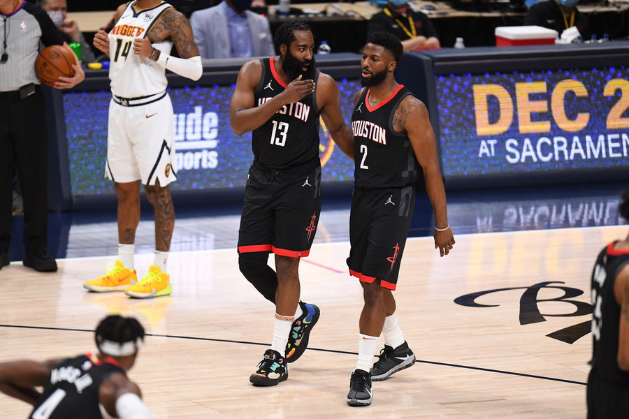 Dec 28, 2020; Denver, Colorado, USA; Houston Rockets guard James Harden (13) and guard David Nwaba (2) speak in the first quarter against the Denver Nuggets at Ball Arena. Mandatory Credit: Ron Chenoy-USA TODAY Sports