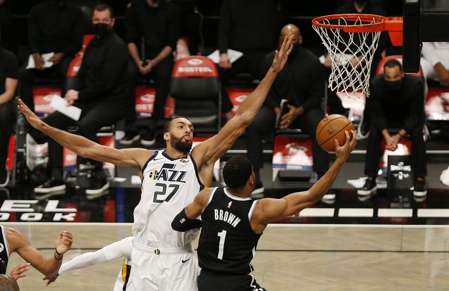 Jan 5, 2021; Brooklyn, New York, USA; Brooklyn Nets guard Bruce Brown (1) drives to the basket against Utah Jazz center Rudy Gobert (27) during the first half at Barclays Center. Mandatory Credit: Andy Marlin-USA TODAY Sports