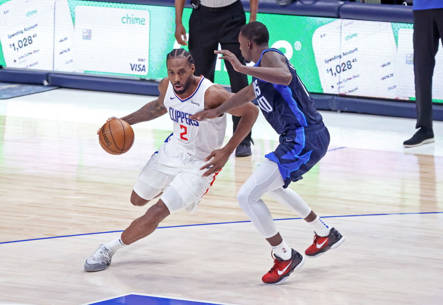 Mar 15, 2021; Dallas, Texas, USA; LA Clippers forward Kawhi Leonard (2) drives to the basket as Dallas Mavericks forward Dorian Finney-Smith (10) defends during the second half at American Airlines Center. Mandatory Credit: Kevin Jairaj-USA TODAY Sports