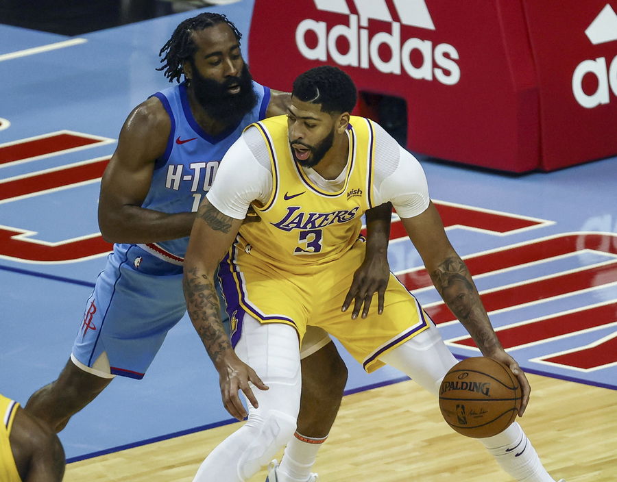 Jan 12, 2021; Houston, Texas, USA; Los Angeles Lakers forward Anthony Davis (3) controls the ball against Houston Rockets guard James Harden (left) during the third quarter at Toyota Center. Mandatory Credit: Troy Taormina-USA TODAY Sports