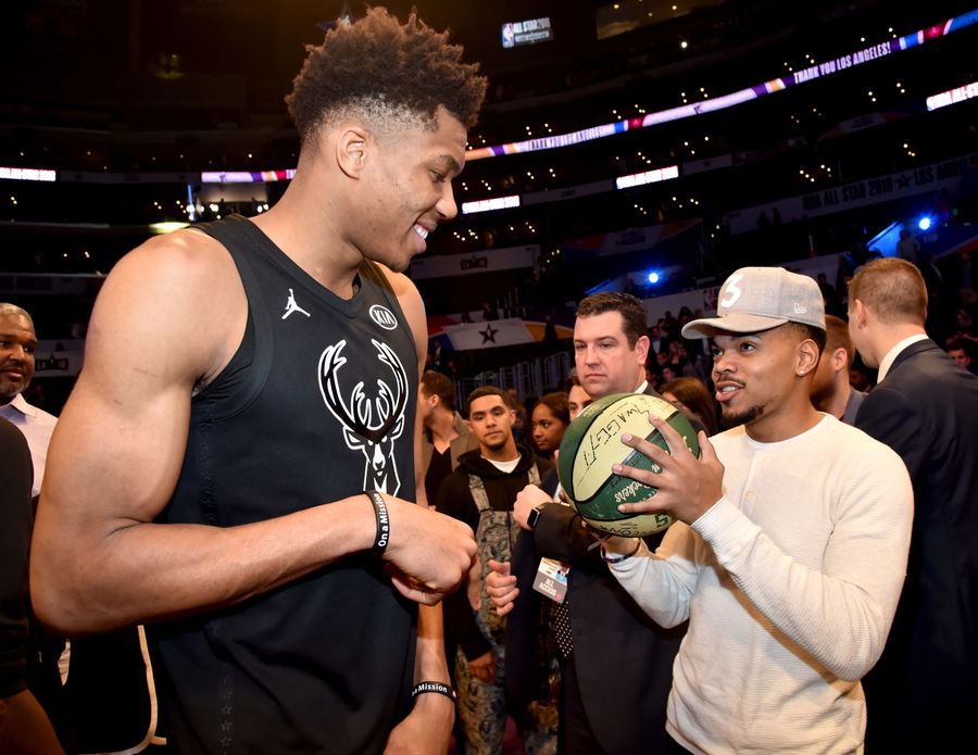 Giannis Antetokounmpo (L) and Chance The Rapper attend the 67th NBA All-Star Game: Team LeBron Vs. Team Stephen at Staples Center on February 18, 2018 in Los Angeles, California. (Photo by Kevin Mazur/WireImage)