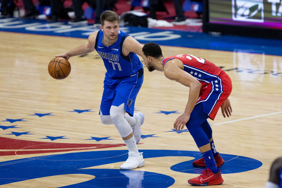 Feb 25, 2021; Philadelphia, Pennsylvania, USA; Dallas Mavericks guard Luka Doncic (77) dribbles against Philadelphia 76ers guard Ben Simmons (25) during the second quarter at Wells Fargo Center. Mandatory Credit: Bill Streicher-USA TODAY Sports
