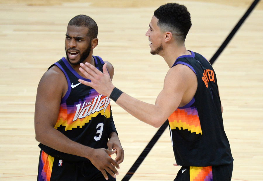 Feb 13, 2021; Phoenix, Arizona, USA; Phoenix Suns guard Chris Paul (3) and Phoenix Suns guard Devin Booker (1) celebrate during the second half against the Philadelphia 76ers at Phoenix Suns Arena. Mandatory Credit: Joe Camporeale-USA TODAY Sports