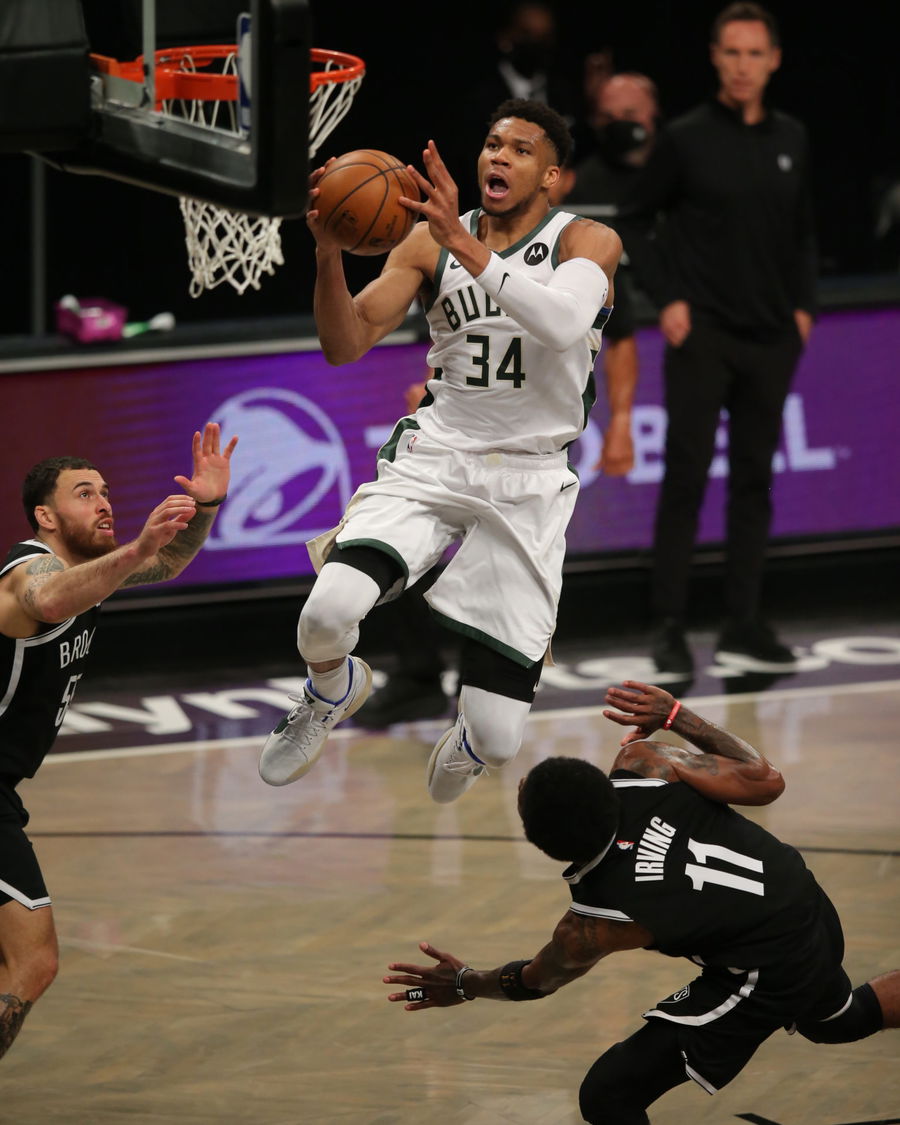 Jun 5, 2021; Brooklyn, New York, USA; Milwaukee Bucks power forward Giannis Antetokounmpo (34) drives to the basket against Brooklyn Nets point guard Mike James (55) and point guard Kyrie Irving (11) during the second quarter of game one in the Eastern Conference semifinals of the 2021 NBA Playoffs at Barclays Center. Mandatory Credit: Brad Penner-USA TODAY Sports