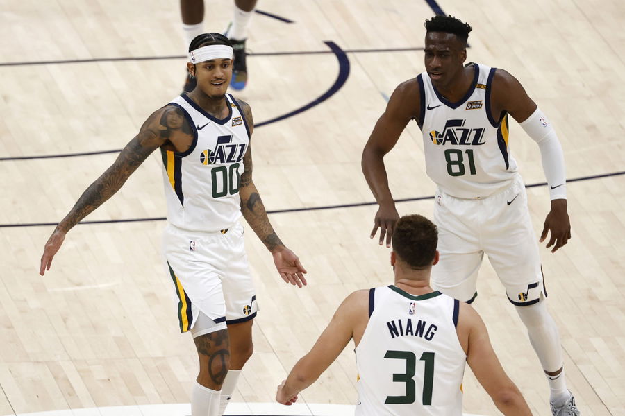 Jan 27, 2021; Salt Lake City, Utah, USA; Utah Jazz guard Jordan Clarkson (00) reacts with guard Miye Oni (81) and forward Georges Niang (31) after a three-pointer in the second quarter against the Dallas Mavericks at Vivint Smart Home Arena. Mandatory Credit: Jeffrey Swinger-USA TODAY Sports