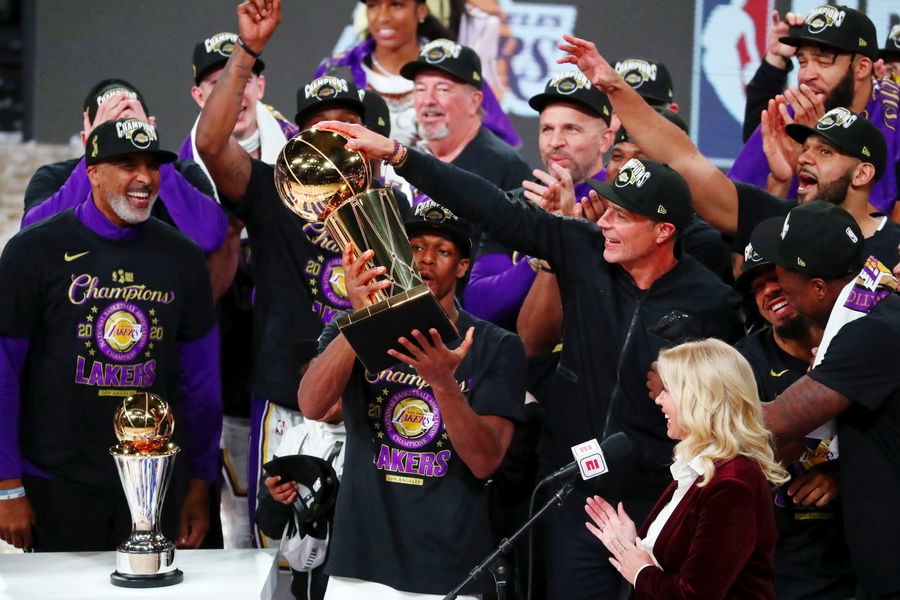 Oct 11, 2020; Lake Buena Vista, Florida, USA; Los Angeles Lakers guard Rajon Rondo (9) holds up the trophy after game six of the 2020 NBA Finals at AdventHealth Arena. The Los Angeles Lakers won 106-93 to win the series. Mandatory Credit: Kim Klement-USA TODAY Sports